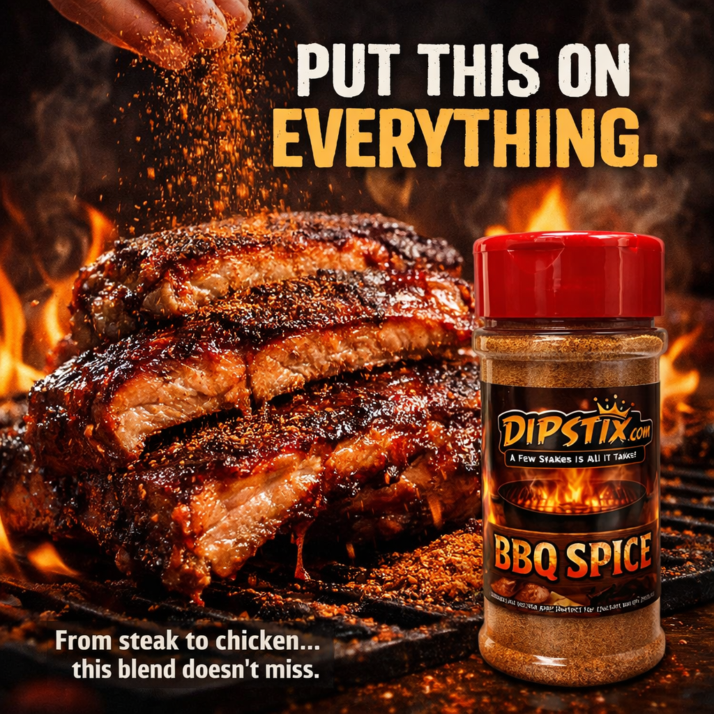 Bring the smoke, the sweet, and the heat with DIPSTIX BBQ Spice—your all-in-one flavor weapon for the grill and beyond. This bold, competition-style blend hits with a perfect balance of rich smokiness, subtle sweetness, and a savory spice backbone that builds a deep, mouthwatering crust on every bite.