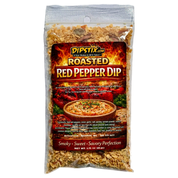 The best Roasted Red Pepper dip in the USA! A premium blend of red bell peppers, roasted red peppers, onion, garlic, salt, sugar, parsley, tomato powder, sesame oil, sodium diacetate, less than 2% silicon dioxide (for anti-caking). Mix 1 packet Roasted Red Pepper DIPSTIX with 1 cup mayonnaise and 1 cup sour cream, let stand for 20 minutes. Try mixing packet with 16 oz. softened cream cheese and use as a tasty cracker spread. Goes great with other veggies, crackers and chips!