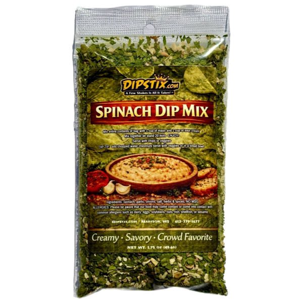 Best selling Spinach Dip! A blend of spinach, onion, garlic and our special blend of spices. Mix 1 Spinach DIPSTIX packet with 1 cup of mayonnaise and 1 cup of sour cream, let stand for 20 minutes and ENJOY! Try Adding chopped water chestnuts for a little crunch or use as a seasoning in any dish or on chicken! Yum! No MSG.